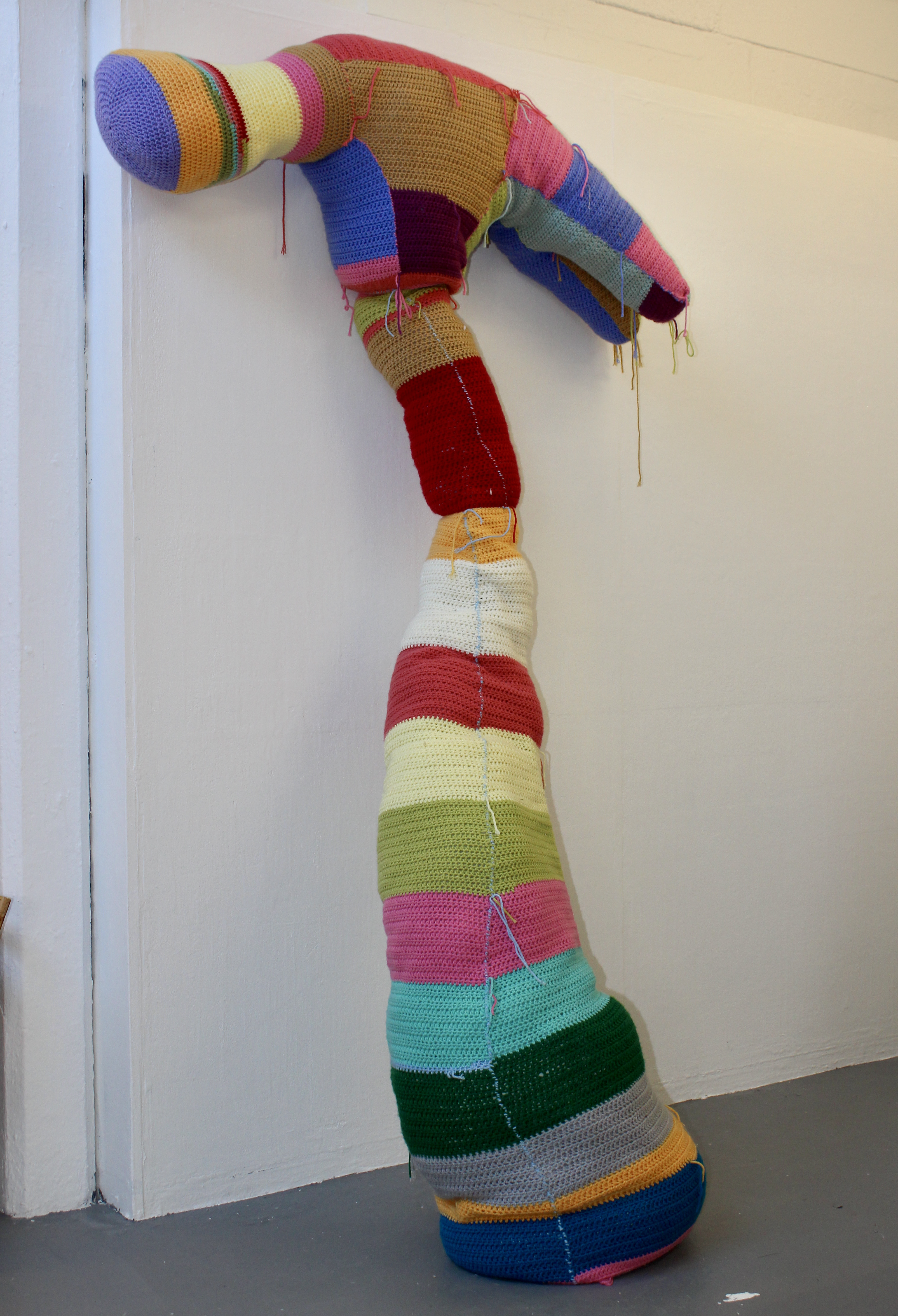 In this piece the material is directly contrasting the function of the object, a hammer. The softness of the crochet, as well as the scale of the piece, renders the hammer, as a tool, completely useless in fulfilling its purpose. It also holds an underlying theme of gender dynamics; the crochet, typically a very feminine craft, has created a tool which historically has been associated with more masculine orientated work; again, adding to the juxtaposition within this work.